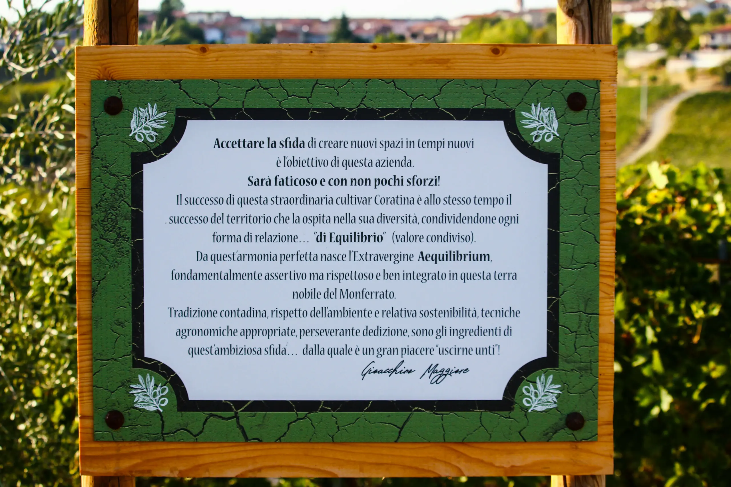 Azienda Agricola Gioacchino Maggiore è una piccola realtà familiare che porta la tradizione e la profonda conoscenza olivicola pugliese nella splendida cornice delle colline monferrine. Coltiviamo cultivar Coratina, espressione autentica di carattere e identità, da cui nasce un olio extravergine intenso, elegante e ricco di personalità: olio EVO “Aequilibrium”.